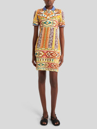 Mini cotton pique dress with placed geometric- and floral-patterned print. The collar and sleeve ends with striped edging complete the model. • Fitted • Buttoned classic collar • Short sleeves • Made in Italy • The model is 5' 9½" (177 cm) tall and wears a size 40 PRODUCT DETAILS • 95% cotton, 5% elastane • Details: 100% cotton