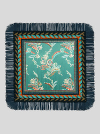 Pure silk twill scarf with daffodil print in the centre. This accessory is complete with a floral-style geometric-patterned hem, the ETRO logo in the corner and embroidered fringing with decorative, multicoloured glass beads at the edges. The accessory was presented at the Autumn-Winter 25 Runway Show. • Size: 35.4 x 35.4 inches (90 x 90 cm) • Made in Italy PRODUCT DETAILS • 100% silk • Fringe details: 100% viscose • Embellishment: glass