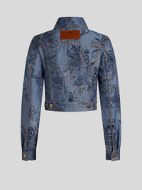 Cropped jacket in cotton-blend jacquard denim with floral Paisley motif. This model is enhanced by metal buttons with a raised Pegaso logo. It features a leather patch bearing the ETRO logo embroidered on the back. • Slim fit • Shirt collar • Single-breasted closure with Pegaso buttons • Breast pockets with Pegaso button • Cuffs with Pegaso button • Made in Italy • The model is 5’10” (178 cm) tall and wears a size 40 (IT) PRODUCT DETAILS • 59% cotton, 41% polyester
