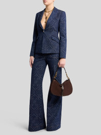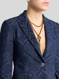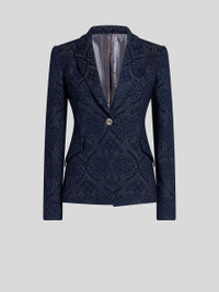 Jacket in faded cotton denim with slight stretch, embellished with abstract jacquard motif. Completing the garment is a metal button with a raised Pegaso symbol. • Fitted • Peak lapels • Single-breasted closure with Pegaso button • Side slip flap pockets • Made in Italy • The model is 5' 9½" (177 cm) tall and wears a size 40 PRODUCT DETAILS • 98% cotton, 2% elastane • Lining: 52% viscose, 48% acetate