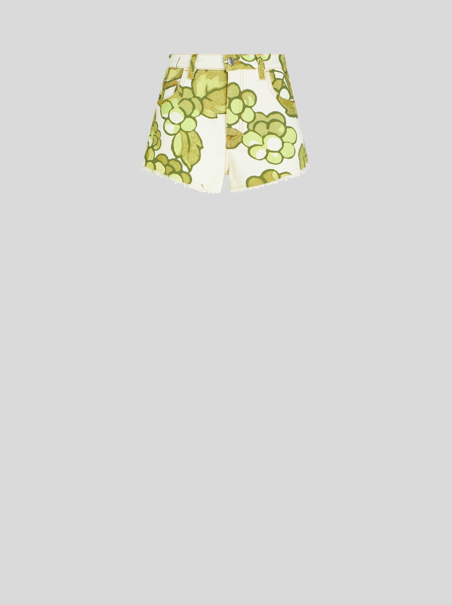 Stretch cotton denim shorts decorated by a macro fruit and plant pattern print. PRODUCT DETAILS • 99% cotton, 1% elastane • Regular fit • High waist • Five pockets • Metal button • Button and zip fastening with flap • Label with embossed ETRO logo with Pegaso applied to rear waist • Made in Italy • The model is 178 cm / 70 inches tall and wears size 26