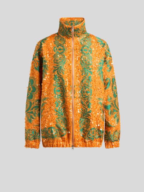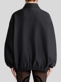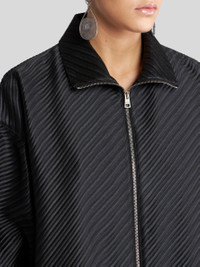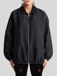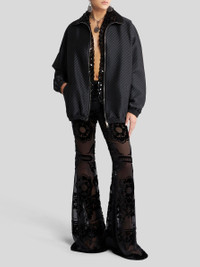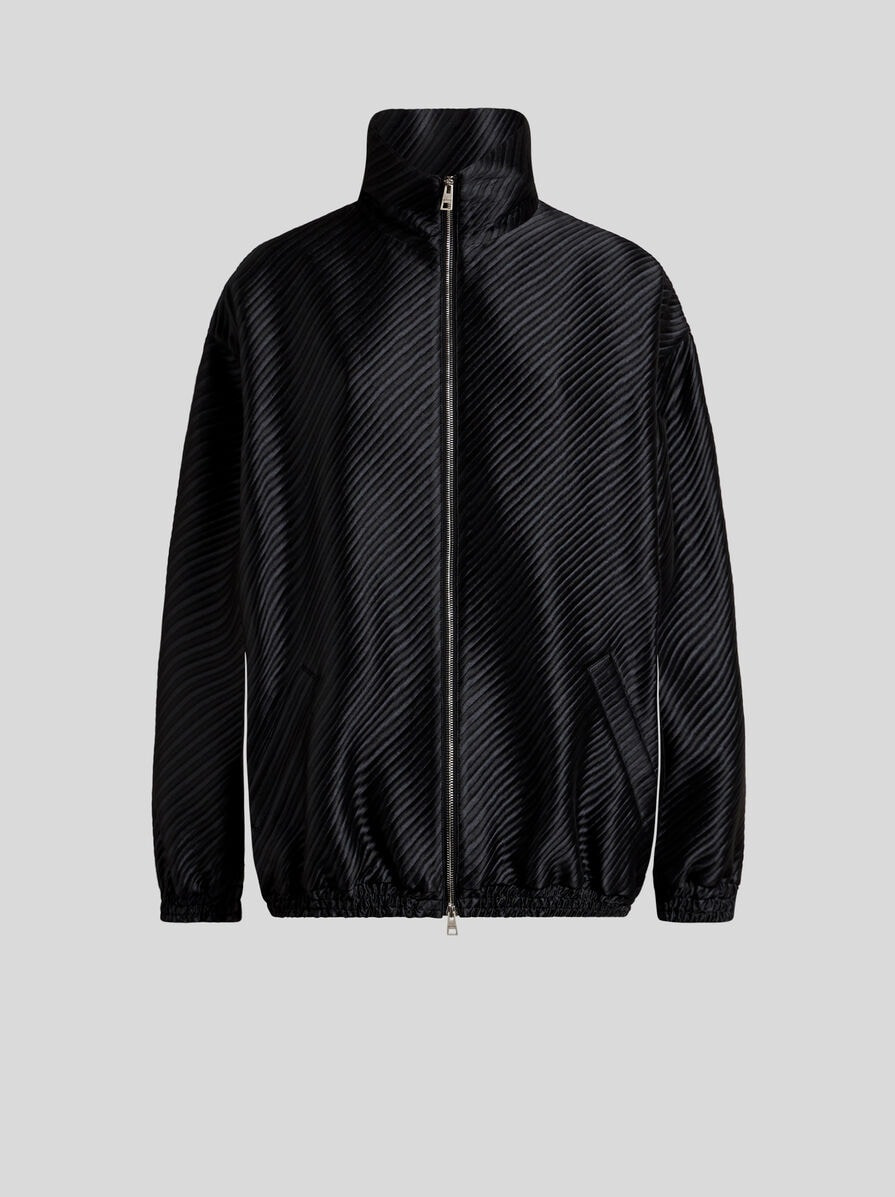 Oversized bomber jacket with refined, diagonally worked jacquard motif. The item, presented at the Spring-Summer 25 Runway Show, features a turtleneck and two-way zip closure. • Oversized fit • Turtleneck • Welt side slip pockets • Two-way zip closure • Made in Italy • The model is 5' 9½" (177 cm) tall and wears a size 40 PRODUCT DETAILS • 81% polyester, 12% polyamide, 7% viscose • Lining: 52% viscose, 48% acetate
