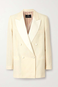 EDITORS'NOTES Inspired by masculine tailoring, Etro's blazer is cut from cotton and wool-blend jacquard for a boxy, slightly loose fit. It has a double-breasted front with wide peak lapels and structured shoulders. Style yours with the matching pants. SIZE & FIT - Fits true to size, take your normal size - Tailored for a slightly loose fit - Mid-weight, non-stretchy fabric - Model is 175cm/ 5'9" and is wearing an IT 40 DETAILS & CARE - Ivory cotton and wool-blend jacquard - Button fastenings through double-breasted front - 53% cotton, 47% wool; lining: 52% viscose, 48% acetate - Dry clean
