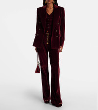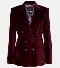 This blazer from Etro is made from soft, luxurious cotton velvet and features a classic double-breasted silhouette. The design is complete with shoulder pads and a Paisley lining for a recognizable touch. Product Details - Material: 98% cotton, 2% elastane - Care instructions: dry clean - Made in Italy - Designer color name: Bordeaux - Item color: burgundy - Lining: 97% viscose, 3% elastane - Peak lapel - Closure: double-breasted (six buttons) - Pockets: flap pockets, breast pocket - Cuff: four buttons - Vent: single - Item number: P01091645 Size & Fit - True to size - Shoulder pad inserts - Cinched waist - Non-stretchy fabric - Falls below the hip - Height of model is 174cm-68.5" and wears a size IT 40