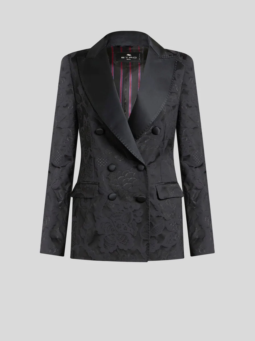 Tailored jacket in glossy stretch jacquard fabric with tone-on-tone pattern. • Slim fit • Satin peak lapels • Double-breasted closure • Satin buttons • Front pockets with flap • Rear vent • Made in Italy • The model is 5' 9½" (177 cm) tall and wears a size 40 PRODUCT DETAILS • Exterior: 52% cotton, 48% viscose • Lapels: 100% polyester • Lining: 52% viscose, 48% acetate