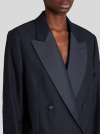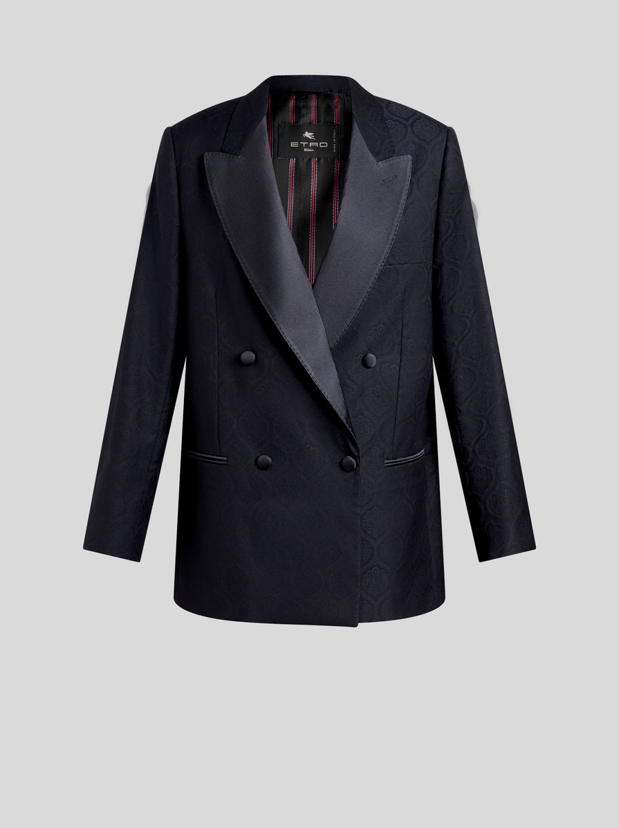 Double-breasted jacket in wool-blend fabric with tone-on-tone woven jacquard motif. This model is embellished with silk appliqués in the same colour tone. PRODUCT DETAILS • 53% cotton, 47% wool • Lining: 52% viscose, 48% acetate • Neck and pockets: 78% silk, 22% polyester • Oversized fit • Peak lapels • Double-breasted closure with buttons • Welt breast pocket • Welt side slip pockets • Rear vent • Made in Italy • The model is 178 cm / 70.07 inches tall and wears a size 40 (IT)