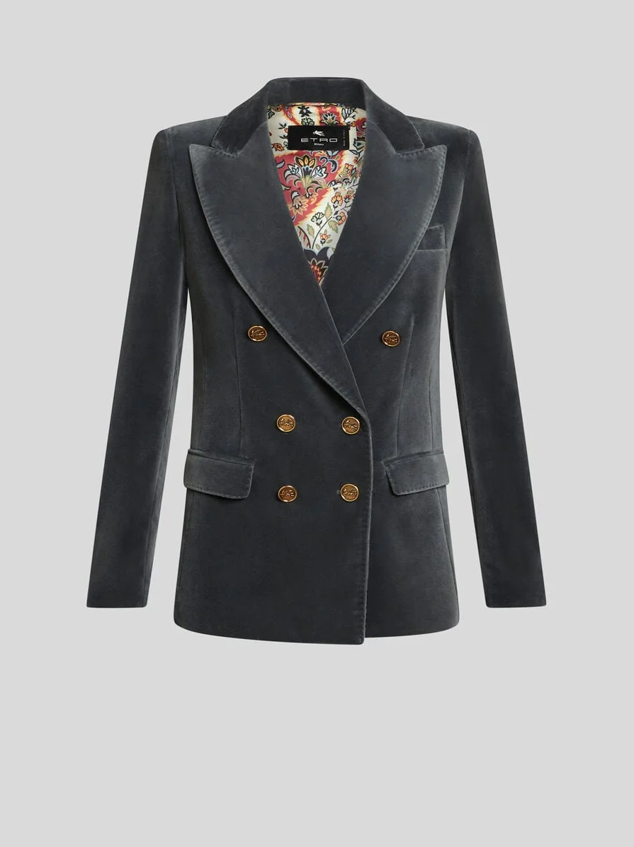 Double-breasted jacket in stretch cotton velvet enhanced by metal buttons with a raised Pegaso logo. This model features inner lining with a decorative floral Paisley print. • Slim fit • Peak lapels • Double-breasted closure with Pegaso buttons • Welt breast pocket • Side slip pockets with flap • Cuffs with Pegaso buttons • Rear vent • Made in Italy • The model is 5’10” (178 cm) tall and wears a size 40 (IT) PRODUCT DETAILS • 99% cotton, 1% elastane • Lining: 97% viscose, 3% elastane