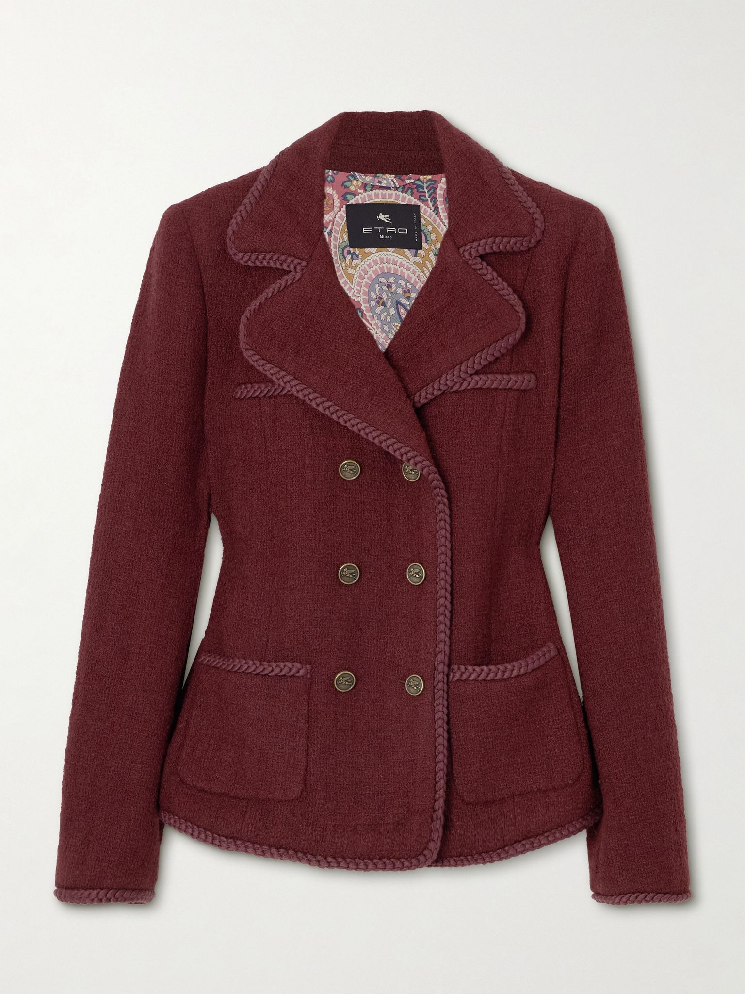 Etro's jacket is timeless and smart. Tailored from wool-blend tweed, it has a double-breasted front and notched lapels trimmed with braided stitching. The lining is printed in the brand's signature swirling paisley pattern. Size & Fit - Fits true to size, take your normal size - Designed for a slightly loose fit - Mid-weight, non-stretchy fabric - Model is 175cm/ 5'9" and is wearing an IT 40 Model measurements: - Bust: 85cm/ 33.5” - Waist: 63cm/ 25” - Hip: 90cm/ 35.5” Details & Care - Burgundy wool-blend tweed - Button fastenings through double-breasted front - 81% wool, 17% mohair, 2% polyamide - Fully lined - Dry clean
