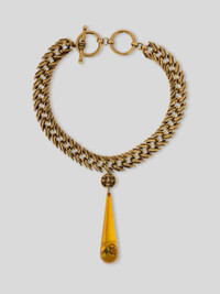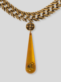 Vintage short necklace with chain and droplet-shaped pendant topped with a sun-face charm and containing a small bee inspired by the iconic Paisley pattern. The accessory was presented at the Autumn-Winter 25 Runway Show. • Length: 15.7 inches (40 cm) • Pendant height: 3.3 inches (8.5 cm) • T-bar closure • Made in Italy PRODUCT DETAILS • Body: 100% brass • Chain: 100% brass • Pendant: 100% resin