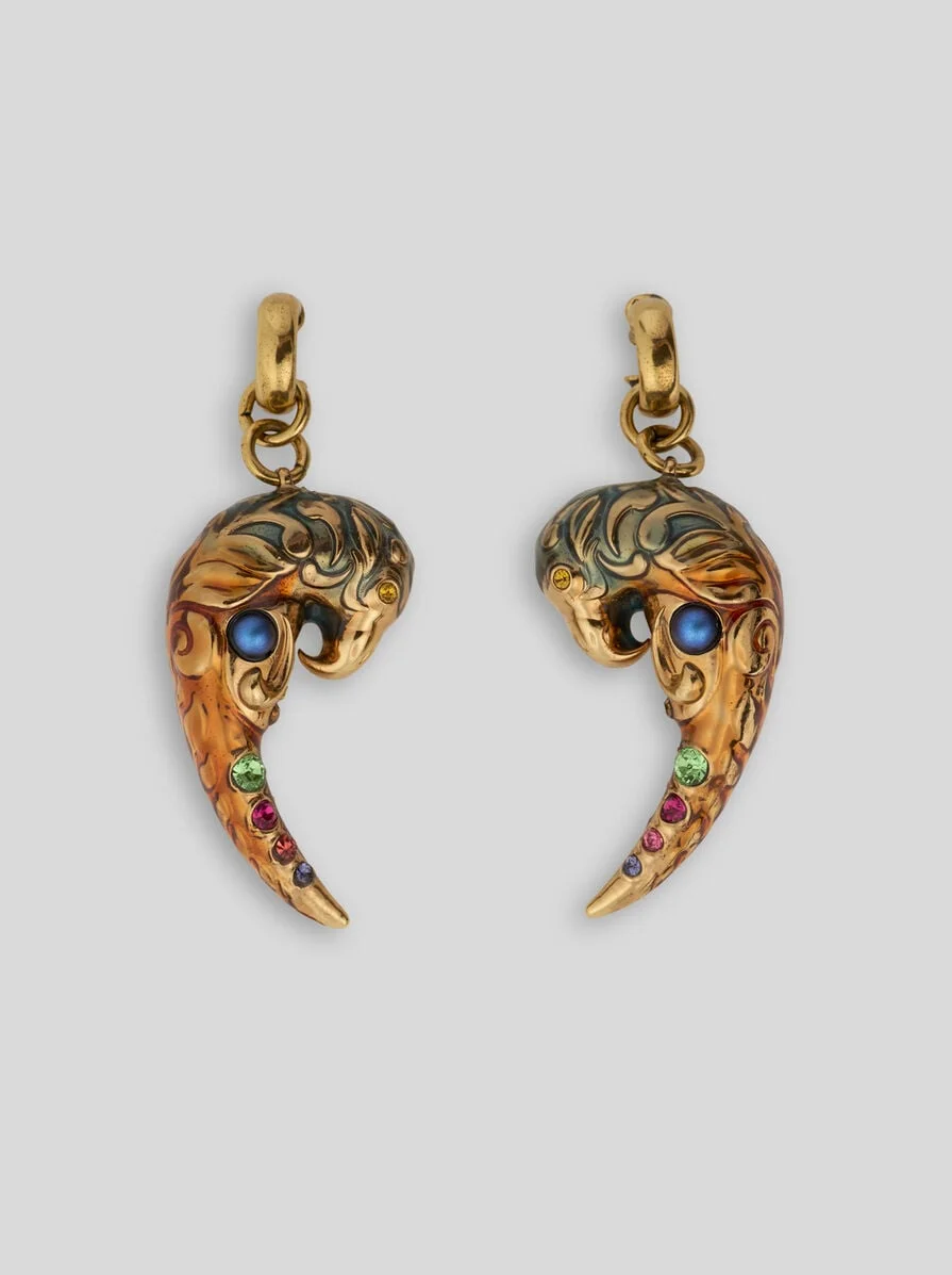 Parrot earrings with shape inspired by the iconic Paisley motif and engraved detailing. This accessory is embellished with small multicoloured crystals. • Height: 2.8 inches (7 cm) • Pin closure • Made in Italy PRODUCT DETAILS • Main material: 100% brass • Appliques: 100% crystal