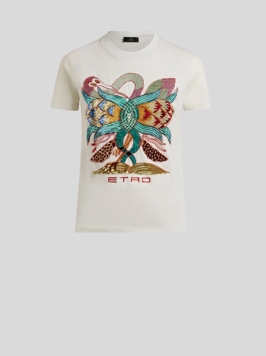 Slim-fit T-shirt in pure cotton fabric. This item features a sequin embroidery in the form of a graphic animal-inspired pattern on the chest, designed by artist Maria Jeon, and is complete with the ETRO logo. The item was presented at the Autumn-Winter 25 Runway Show. • Slim fit • Crewneck • Short sleeves • Made in Italy • The model is 5' 9½" (176 cm) tall and wears a size S PRODUCT DETAILS • 100% cotton • Embellishment: PVC and glass