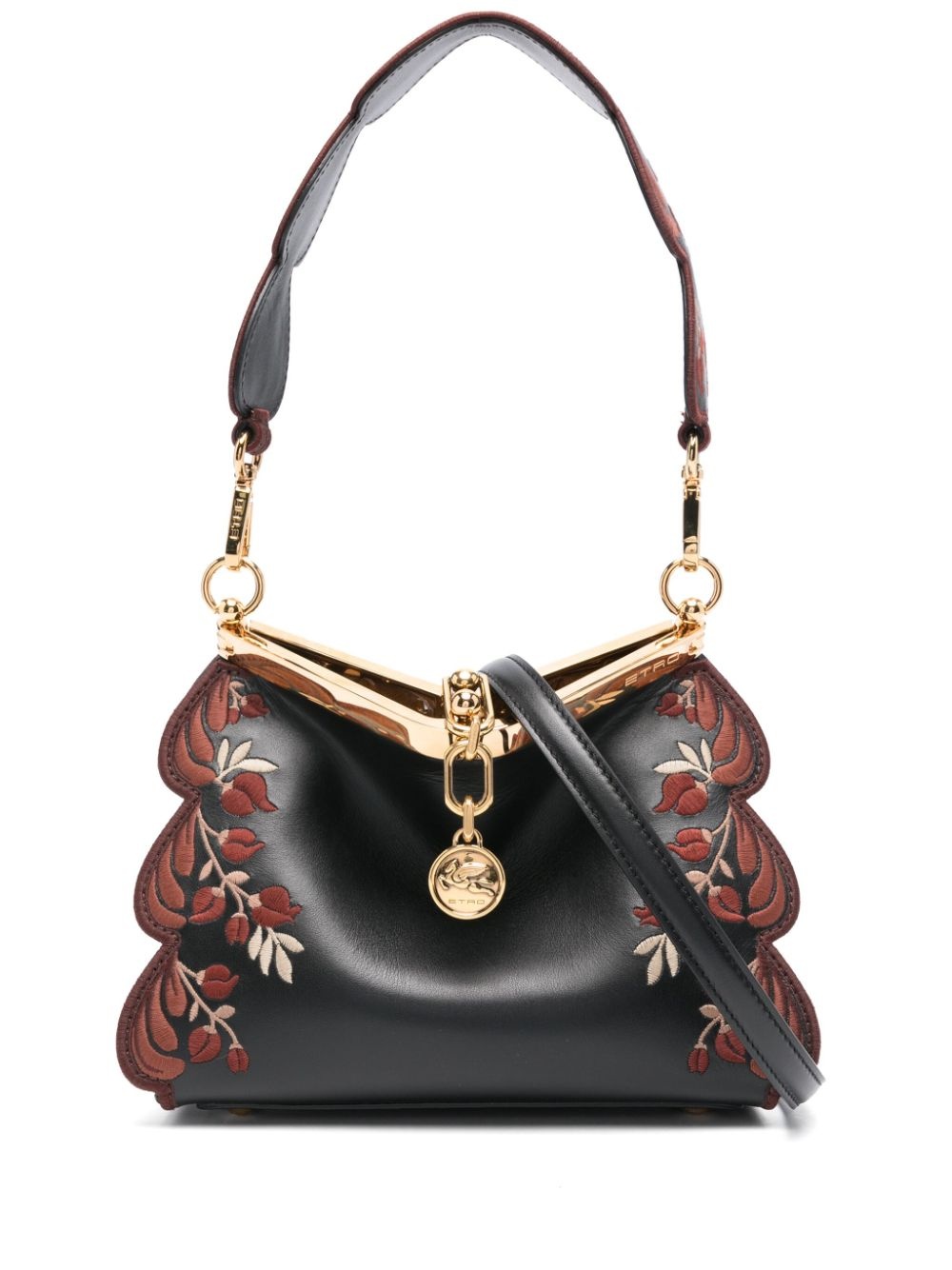 small Vela shoulder bag Highlights - Black/earth brown/light beige - Calf leather - Smooth grain - Clasp fastening - Adjustable detachable shoulder strap - Floral embroidery to the front - Floral embroidery to the rear - Metal feet - Main compartment - Suede lining - This piece comes complete with a protective dust bag. Made in Italy Composition Outer: Calf Leather 100% SIZE & FIT Model measurements Height 5 ft 9 in(1.75 m) Bust/Chest 30.7 in(78 cm) Hips 34.64 in(88 cm) Waist 23.22 in(59 cm) Measurement DEPTH 3.93 in(10 cm) HEIGHT 5.9 in(15 cm) WIDTH 9.44 in(24 cm)