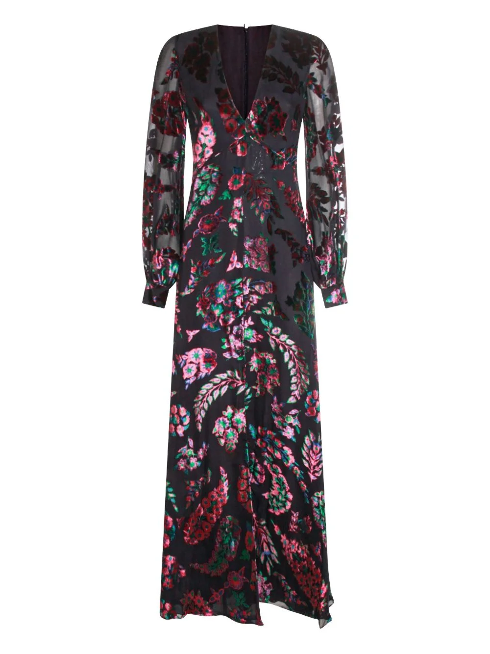 floral-velvet maxi dress Highlights - Blue and multicolour - Floral velvet print - V-neck - Long sleeves Made in Italy Composition Viscose 69%, Silk 31% Washing instructions Read Manufacturer Guidelines