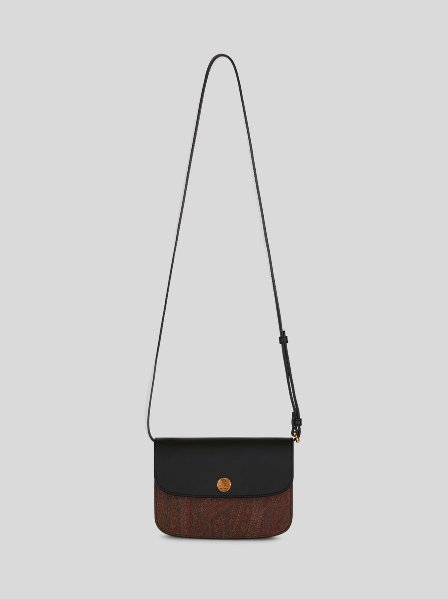 ETRO Essential crossbody bag in the iconic Paisley jacquard canvas featuring a fastening with contrasting leather flap and button with ETRO logo and Pegaso. The bag is embellished by a suede lining and is perfect to be worn on the shoulder, as a crossbody bag or handbag. PRODUCT DETAILS • 19 x 14 x 4.5 cm / 7.48 x 5.51 x 1.77 inches • Exterior: Paisley fabric. Front: 76% cotton. 24% polyester; Back: 100% cotton • Coating_PVC • Details: 100% calfskin • Interior: 100% lambskin • Two inside compartments • Rear pocket • Magnetic button fastening • Detachable and adjustable shoulder strap length (drop) 55 cm / 21.65 inches • Gold-finish metal accessories • Made in Italy