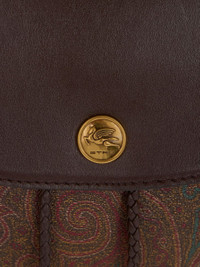 ETRO Essential compact backpack made from iconic Paisley jacquard fabric, with leather details. The accessory, equipped with buckle-adjustable shoulder straps, features a press stud-fastened flap complete with a symbolic minted metal coin featuring the Pegaso logo. The embossed brand logo on the back completes the design. • Dimensions (Width, Height, Depth): 7.3 x 8.7 x 3.9 inches (18.5 x 22 x 10 cm) • Flap and press-stud closure • Adjustable shoulder straps • Gold-finish metal accessories • Inner drawstring • Outer D-rings • Made in Italy PRODUCT DETAILS • Exterior: Paisley jacquard cotton fabric coated with matt texture and lined with canvas • Coating: 100% PVC • Details: calfskin • Interior: cowhide