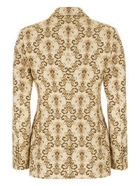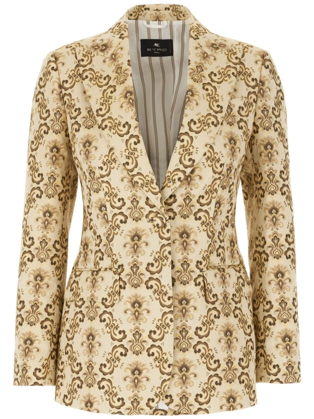 embroidered blazer Highlights - Beige - Embroidered design - Front button fastening - Peak lapels - Long sleeves with buttoned cuffs - Chest welt pocket - Two front flap pockets - English rear vents - Straight hem Made in Italy Composition Outer: Polyester 49%, Cotton 48%, Metallic Fibre 4%, Nylon 1% Lining: Viscose 52%, Acetate 48% SIZE & FIT Measurement BUST 33.07 in(84 cm) LENGTH 26.77 in(68 cm) WAIST 32.28 in(82 cm) SLEEVE LENGTH 14.96 in(38 cm)