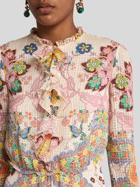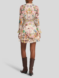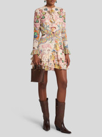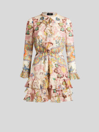 Silk pekin mini dress embellished with floral print all over. This model features decorative, delicate tonal ruffles. • Regular fit • Crew neck • Long sleeves • Made in Italy • The model is 5' 9½" (177 cm) tall and wears a size 40 PRODUCT DETAILS • 100% silk • Lining: 100% polyester