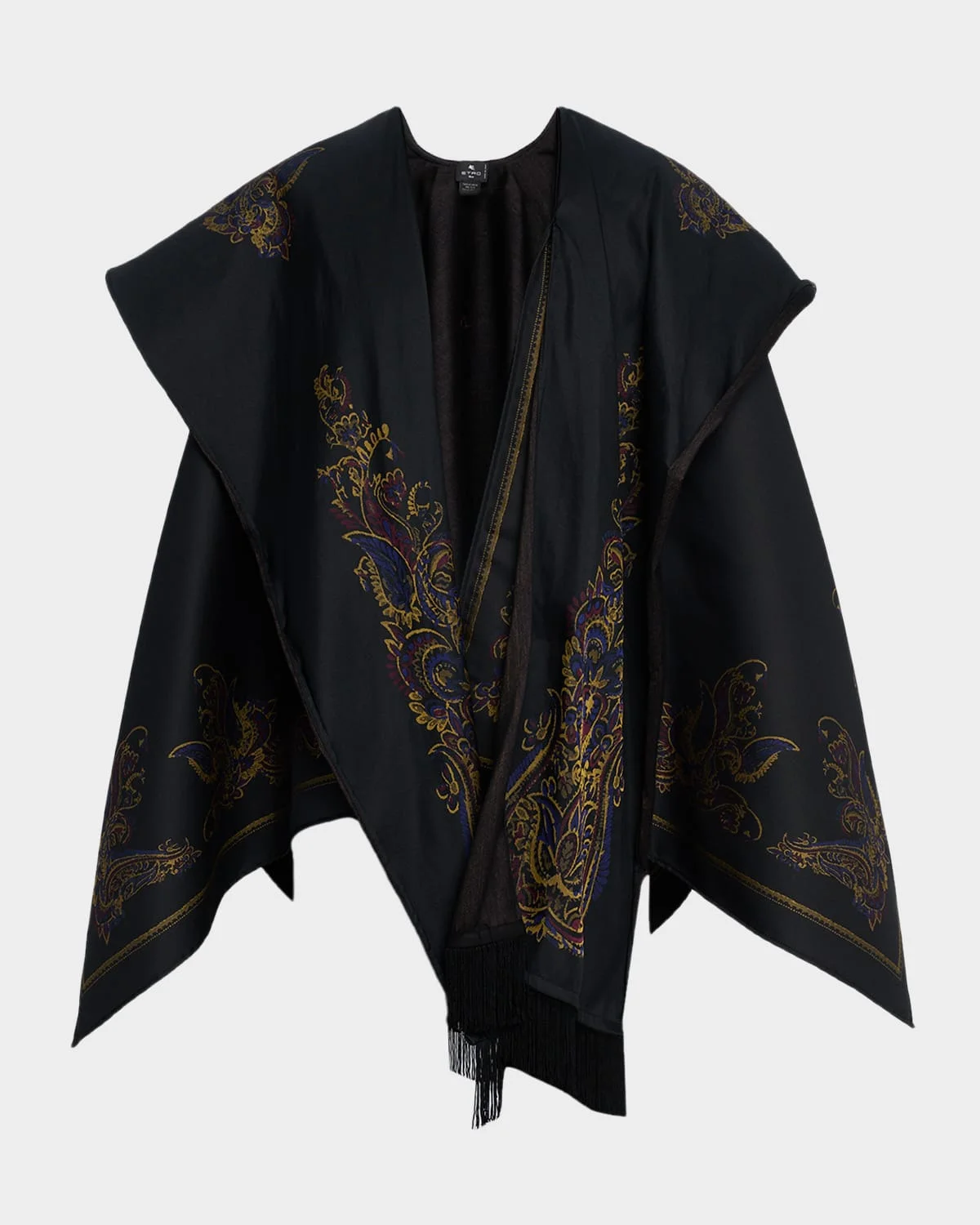 Distinguished by a draped and layered silhouette, this Etro cape features an intricate, floral paisley jacquard pattern. Open front Cape sleeves Fringe trim Polyester/wool Made in Italy