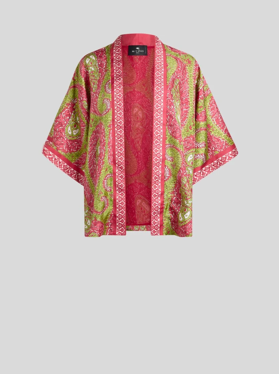 Pure silk twill Kesa robe with all-over motif featuring Paisleys and foliage-inspired elements. Completing the design are the edges embellished with a colour-matched medallion pattern. • Easy fit • Kimono sleeves • Made in Italy • The model is 5' 9½" (176 cm) tall and wears a size S PRODUCT DETAILS • Exterior: 100% silk • Lining: 100% silk