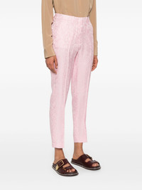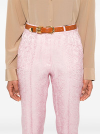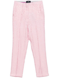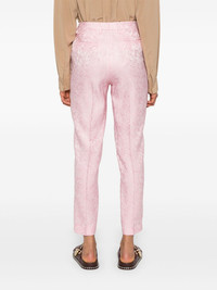 jacquard stovepipe trousers Highlights - Bubblegum pink - Concealed front button, hook and zip fastening - Belt loops - Two side slash pockets - Two rear welt pockets Made in Italy Composition Viscose 79%, Silk 21% SIZE & FIT Model measurements Height 5 ft 10 in(1.77 m) Bust/Chest 33.07 in(84 cm) Hips 37 in(94 cm) Waist 24.8 in(63 cm) FittingInformation Designed for a tapered fit, these trousers allow for a close fit at the waist and a loose unrestricted fit over the leg with a closer fit towards the ankle Cropped in length Made from a midweight non-stretch fabric