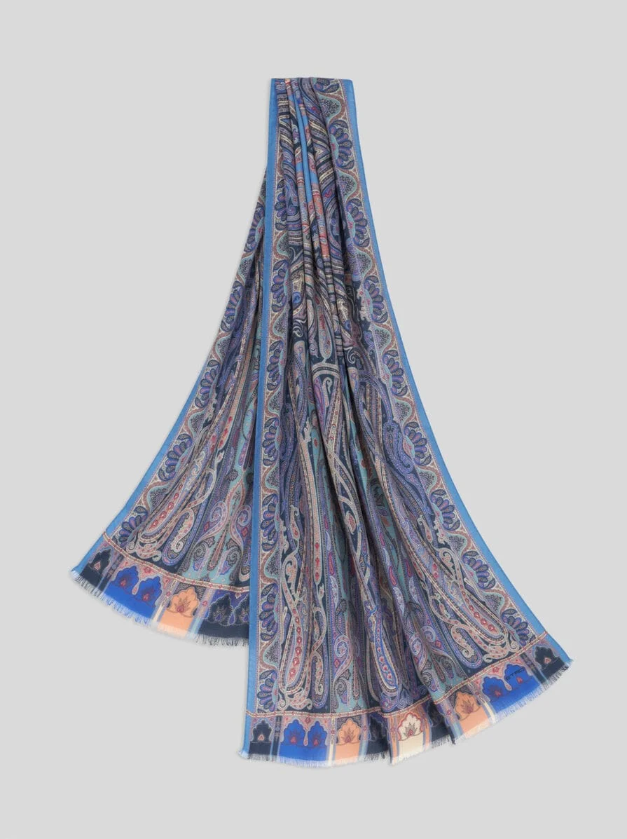 Cashmere- and silk-blend scarf with decorative, elaborate Paisley print. Completing the accessory are the slightly frayed short sides, striped pattern and an Etro logo in the corner. • Size: 27.6 x 66.9 inches (70 x 170 cm) • Made in Italy PRODUCT DETAILS • 70% cashmere, 30% silk