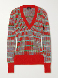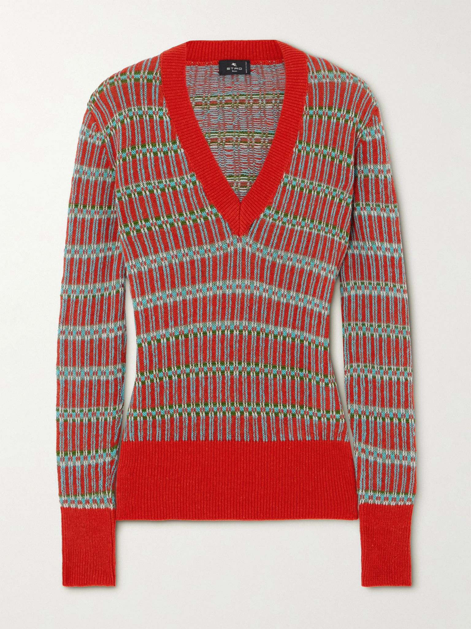 Etro's sweater opened the Fall '25 runway styled with paisley jeans and an oversized plush coat. It's made from wool for a slim fit and jacquard-knitted with geometric motifs in bright turquoise threads. The V-neck will nicely frame a pendant. Size & Fit - Fits true to size, take your normal size - Designed for a slim fit - Mid-weight knit - Model is 180cm/ 5'11" and is wearing an IT 40 Model measurements: - Bust: 86cm/ 34" - Waist: 65cm/ 25.5" - Hip: 90cm/ 35.5" Details & Care - Multicoloured wool-blend - Slips on - 50% wool, 50% acrylic - Hand wash
