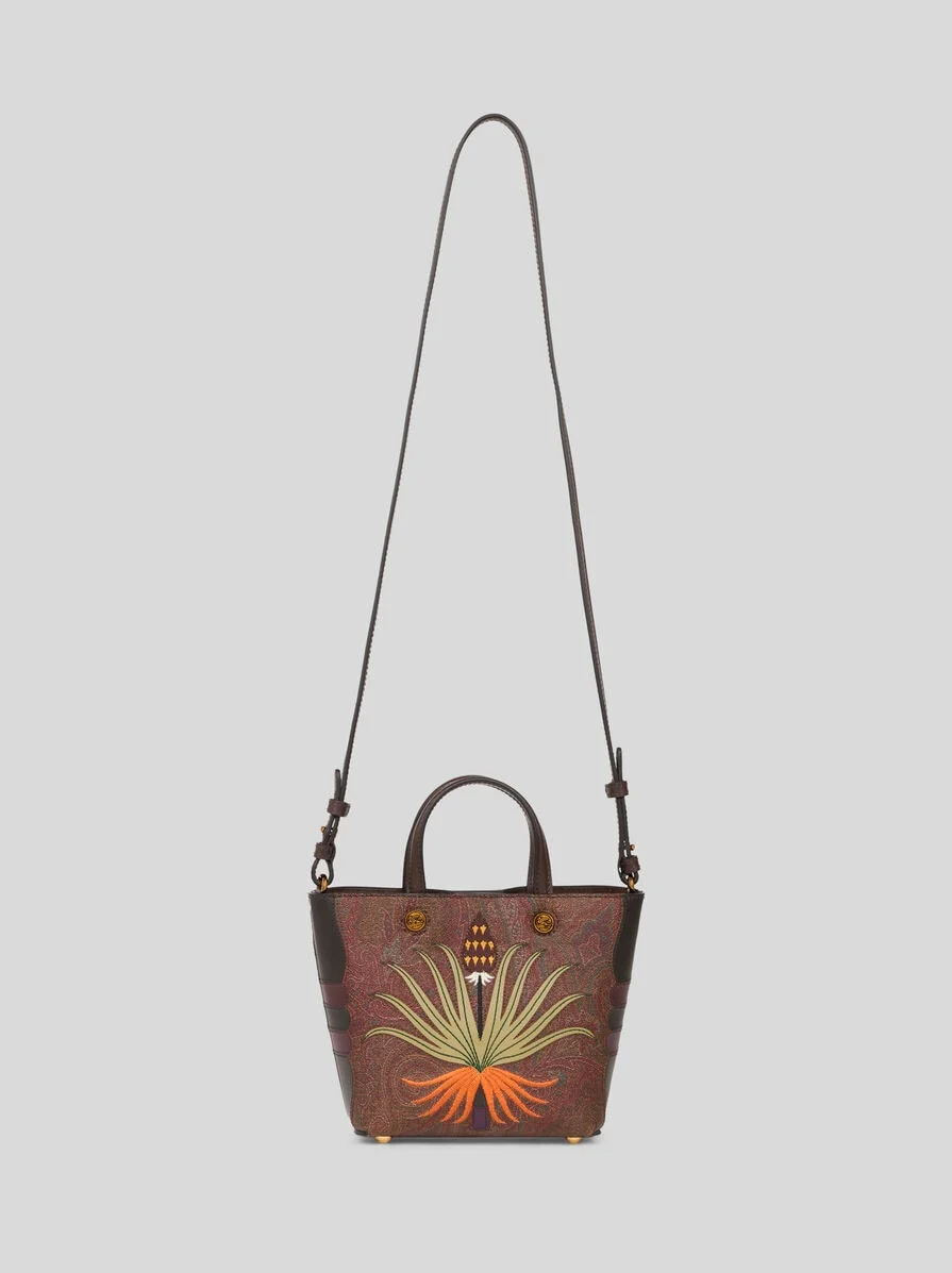 Mini ETRO Essential tote bag in iconic Paisley jacquard fabric, with leather details. Embellished with a raised Pegaso symbol and ETRO logo,, it features an embroidered motif inspired by the works of the artist Agostino Iacurci. It has a detachable shoulder strap. • Size (Width, Height, Depth): 6.3 x 6.3 x 3.5 inches (16 x 16 x 9 cm) • Fastened with magnetic button • Two handles • Detachable adjustable shoulder strap • Metal feet • Golden-finish metal accessories • Made in Italy PRODUCT DETAILS • Exterior: Paisley jacquard cotton fabric coated with matt texture and lined with canvas • Coating: 100% PVC • Embroidery: 100% polyester • Details: calfskin