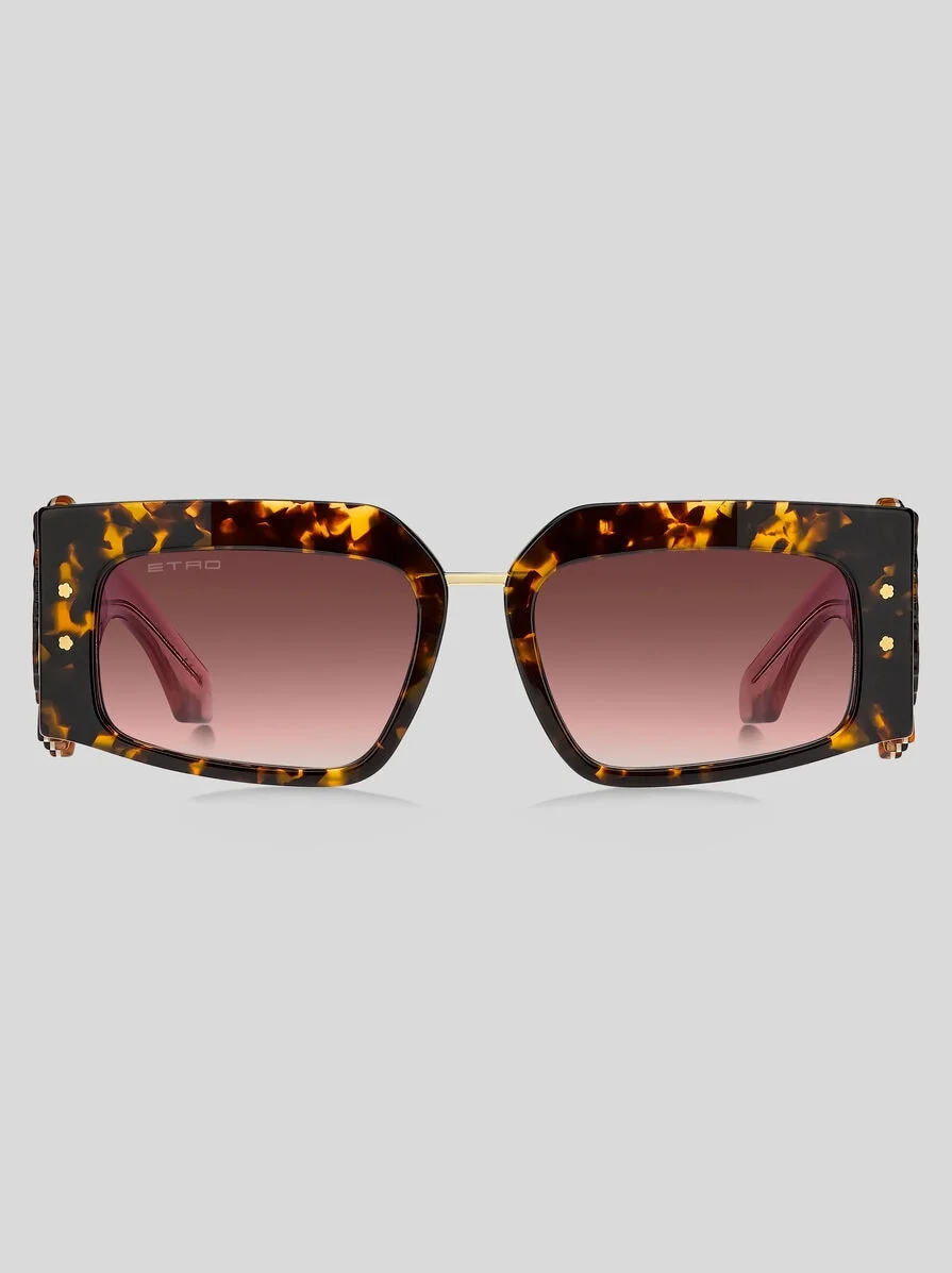 ETRO's commitment to craftsmanship and innovation is evident in these ETROBlossom sunglasses. Defined by bold volumes and geometric shapes, the thick acetate frame is balanced by the sleek metal nose bridge and punctuated with matching gold-tone screws resembling flowers, created exclusively for this style. Deceptively simple from the front, the temples reveal intricate high-relief blossom embellishments – a signature theme spotted on the runway – and a subtle inlet logo. ETRO's trademark end tips add an unmissable touch. PRODUCT DETAILS • Frame: acetate • Lenses with UV protection • Fitting: international • Lens: 36,7 mm, bridge: 18 mm, temples: 145 mm • Made in Italy