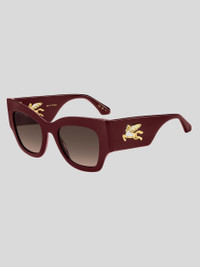 Refined and quintessentially ETRO, these sunglasses make a stunning statement with their bold shape, exquisite construction and the precious Pegaso detail – crafted from a single piece of metal to create an unexpected cutout effect. They're made from premium acetate developed exclusively for the brand, finished using a milling process, and available in classic black, ETRO's burgundy, and Paisley-patterned variations that give fresh energy to heritage codes. PRODUCT DETAILS • Frame: acetate • Lenses with UVA and UVB protection • Fitting: international • Lens: 44,7mm, bridge: 22mm, temple: 140mm • Made In China