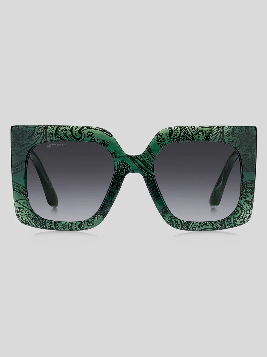 Refined and quintessentially ETRO, these sunglasses make a stunning statement with their bold shape, exquisite construction and the precious Pegaso detail – crafted from a single piece of metal to create an unexpected cutout effect. They're made from premium acetate developed exclusively for the brand, finished using a milling process, and available in classic black, ETRO's burgundy, and Paisley-patterned variations that give fresh energy to heritage codes. PRODUCT DETAILS • Frame: acetate • Lenses with UVA and UVB protection • Fitting: global fitting • Lens: 39,5mm, bridge: 21mm, temple: 135mm • Made In China