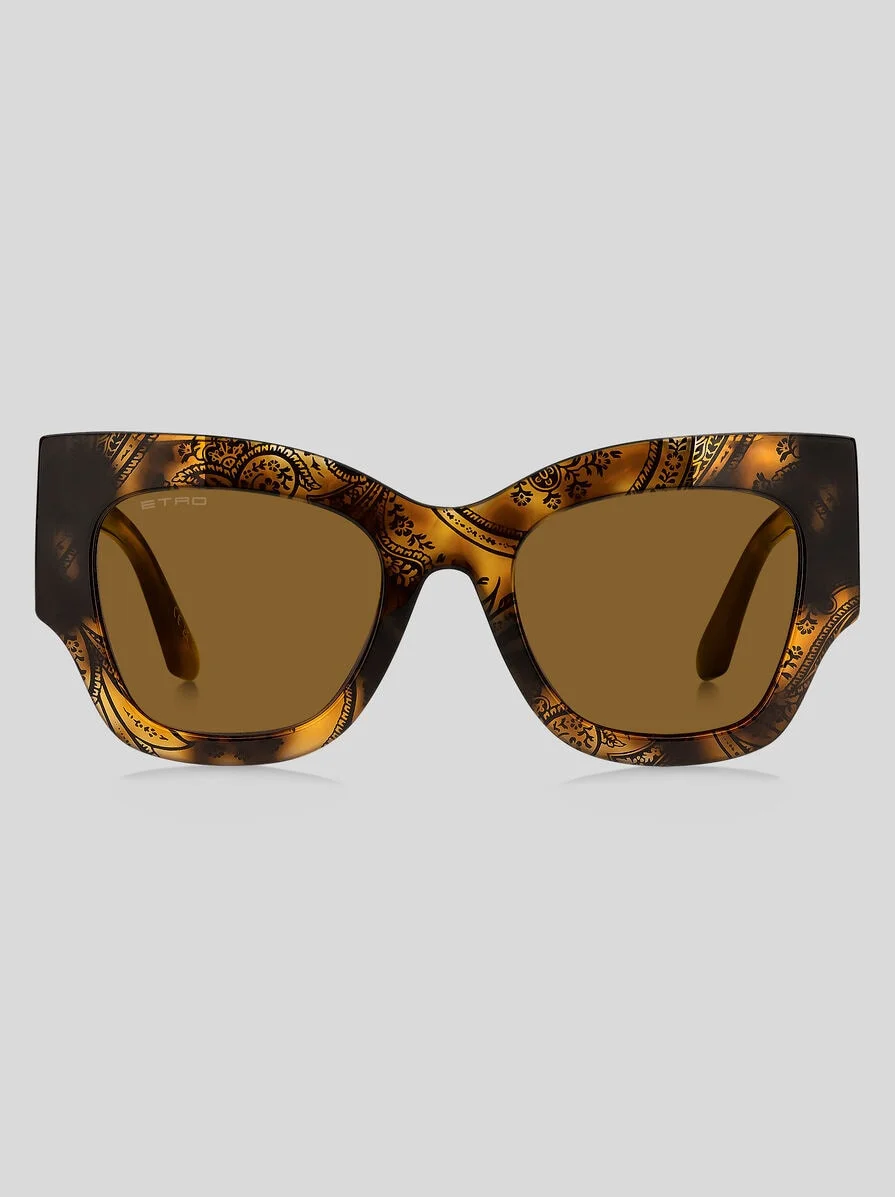 Refined and quintessentially ETRO, these sunglasses make a stunning statement with their bold shape, exquisite construction and the precious Pegaso detail – crafted from a single piece of metal to create an unexpected cutout effect. They're made from premium acetate developed exclusively for the brand, finished using a milling process, and available in classic black, ETRO's burgundy, and Paisley-patterned variations that give fresh energy to heritage codes. PRODUCT DETAILS • Frame: acetate • Lenses with UVA and UVB protection • Fitting: international • Lens: 48,7mm, bridge: 22mm, temple: 140mm • Made In China