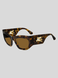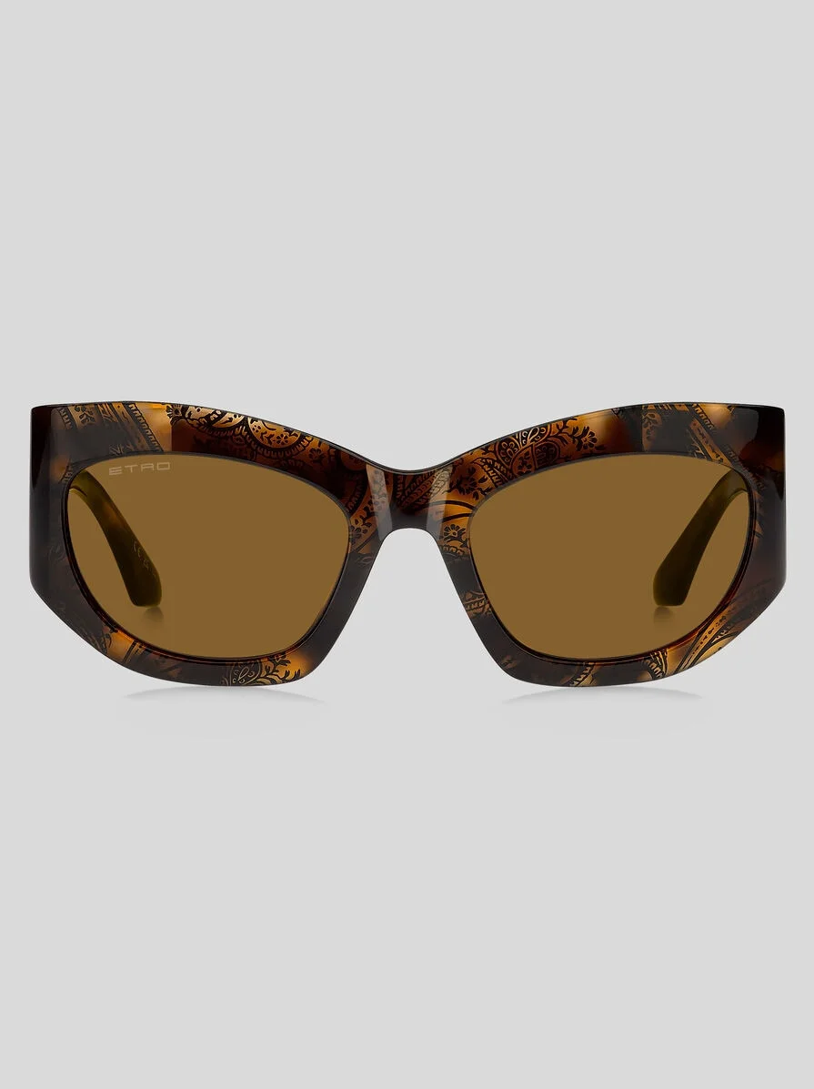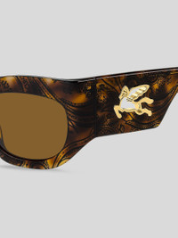 Refined and quintessentially ETRO, these sunglasses make a stunning statement with their bold shape, exquisite construction and the precious Pegaso detail – crafted from a single piece of metal to create an unexpected cutout effect. They're made from premium acetate developed exclusively for the brand, finished using a milling process, and available in classic black, ETRO's burgundy, and Paisley-patterned variations that give fresh energy to heritage codes. PRODUCT DETAILS • Frame: acetate • Lenses with UVA and UVB protection • Fitting: global fitting • Lens: 39,5mm, bridge: 21mm, temple: 135mm • Made In China