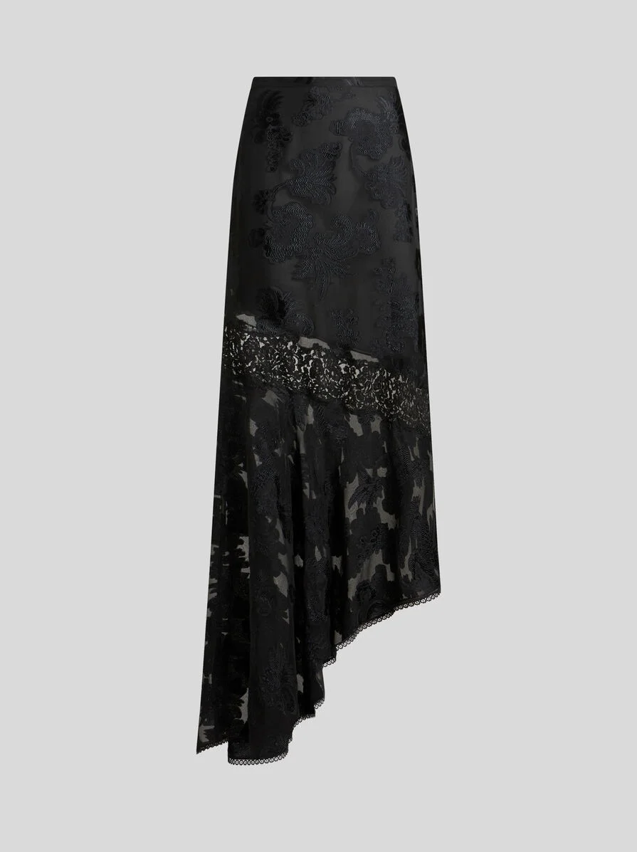 Asymmetric maxi skirt in fil coupe chiffon with lace detailing. This model features scalloped trim-finished hems. • Regular fit • Regular-rise waist • Made in Italy • The model is 5' 9½" (177 cm) tall and wears a size 40 PRODUCT DETAILS • Exterior: 56% viscose, 44% silk • Lace: 70% cotton, 30% polyamide • Details: 100% cotton • Lining: polyester