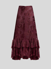 Maxi skirt in fil coupe silk-blend chiffon with tone-on-tone floral motif. This model is embellished with small drapes at the waist and is complete with two flounces at the bottom. • Regular fit • High waist • Rear zip closure • Made in Italy • The model is 5' 9½" (177 cm) tall and wears a size 40 PRODUCT DETAILS • 56% viscose, 44% silk • Lining: 100% polyester