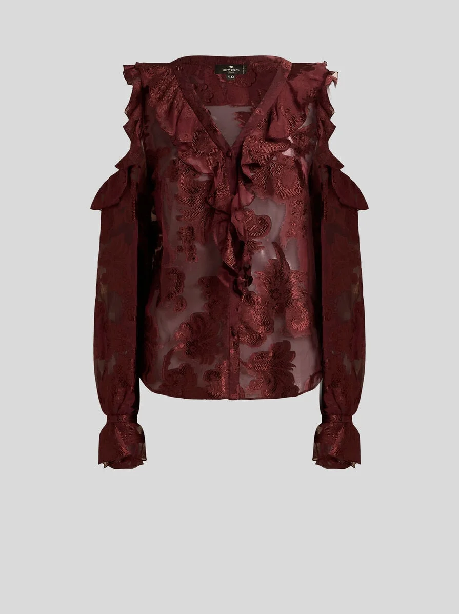 Long-sleeved shirt in see-through-effect chiffon with foliage-inspired fil coupe embellishment. This model features long puff sleeves that leave the shoulders uncovered and decorative tonal ruffles. • Regular fit • V-neck • Fastened with covered buttons • Puff sleeves • Made in Italy • The model is 5' 9½" (177 cm) tall and wears a size 40 PRODUCT DETAILS • 56% viscose, 44% silk