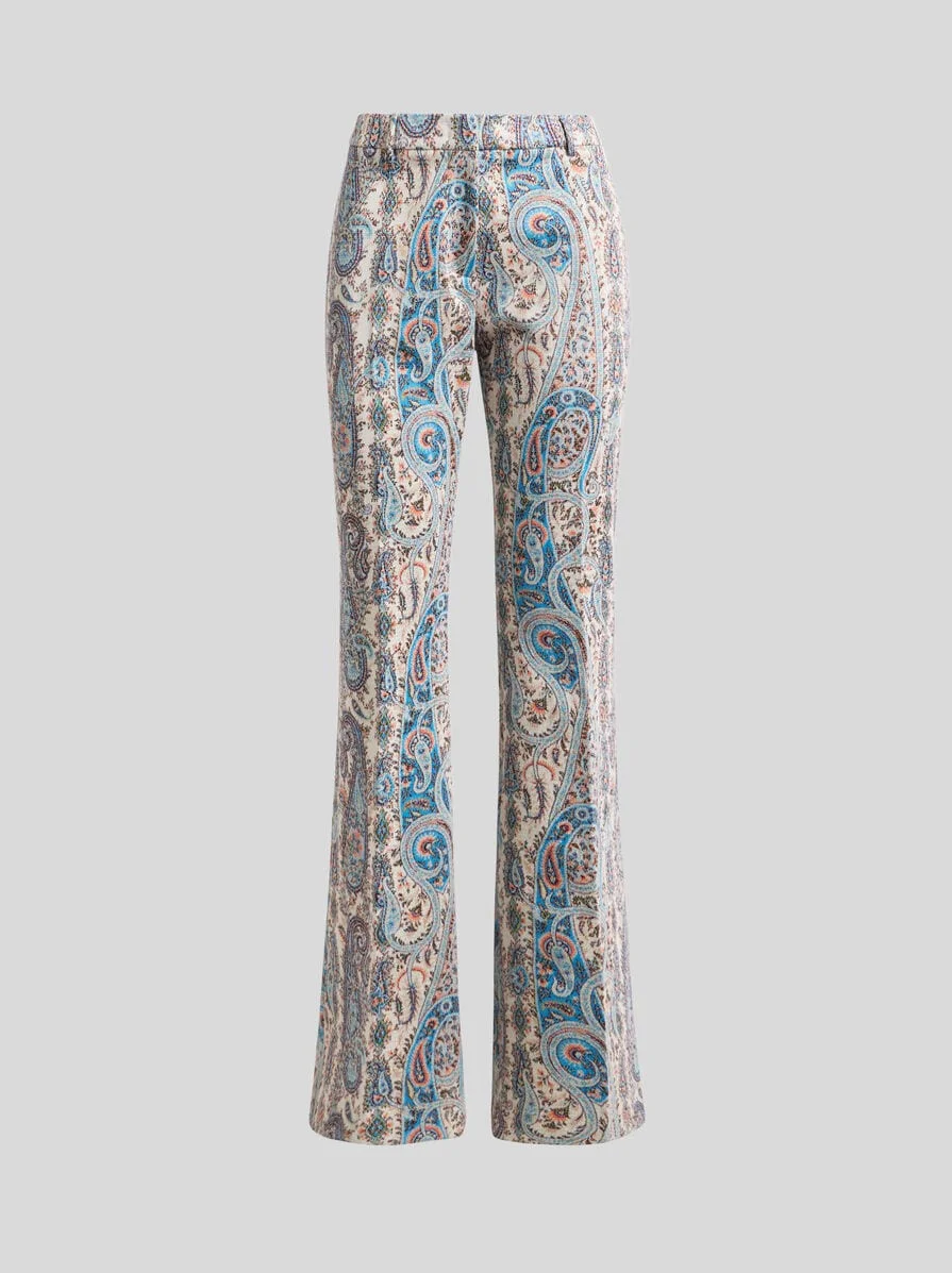 Flared-leg trousers in slightly stretchy cotton-blend jacquard jersey. This garment stands out for its all-over Paisley motif with foliage-inspired elements. • Fit-and-flare fit • Regular-rise waist • Rear welt pockets • Concealed hook and zip closure • Made in Italy • The model is 5' 9½" (176 cm) tall and wears a size 40 PRODUCT DETAILS • 63% cotton, 18% viscose, 15% polyester, 3% polyamide, 1% elastane