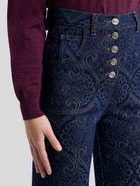 Five-pocket jeans with snug fit at the sides and flared hems, made from faded cotton denim with slight stretch and embellished with abstract jacquard motif. These stand out for their Pegaso button fastening and flared shape from the knee down. Rear leather label with ETRO logo and Pegaso symbol. • Regular fit • High waist • Five pockets • Fastened with Pegaso buttons • Made in Italy • The model is 5' 9½" (177 cm) tall and wears a size 26 PRODUCT DETAILS • 98% cotton, 2% elastane