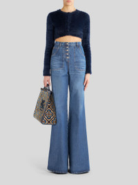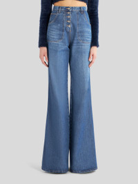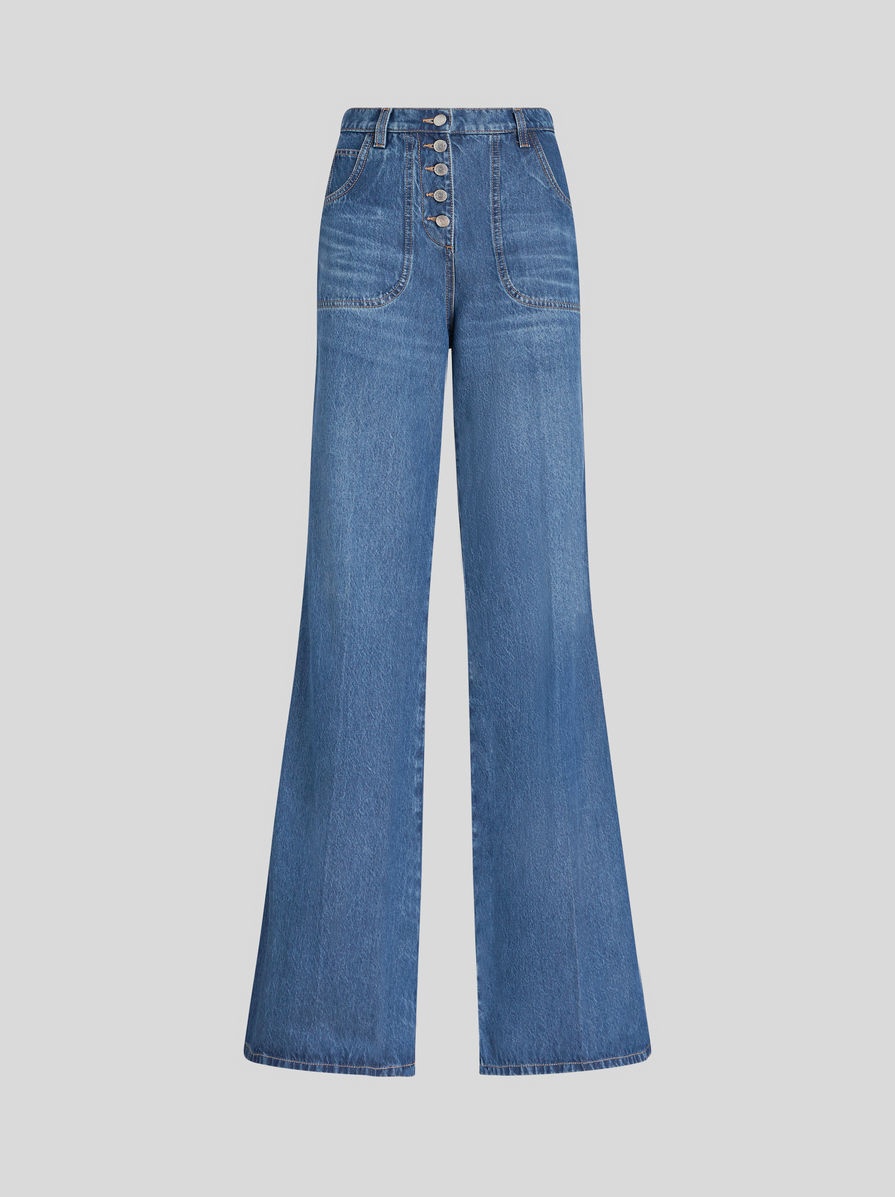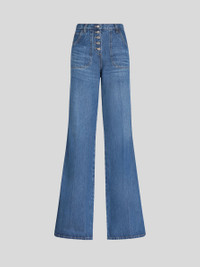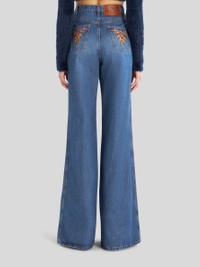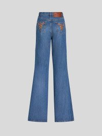 High-waisted flared jeans decorated with multi-coloured foliage embroidery on rear. PRODUCT DETAILS • 100% cotton • Embroidery: 100% polyester • Slim fit • High waist • Five pockets • Button and zip fastening • Metal button • Label with ETRO logo and embossed Pegaso applied to rear waist • Made in Italy • The model is 178 cm/70 Inches tall and wears size 26