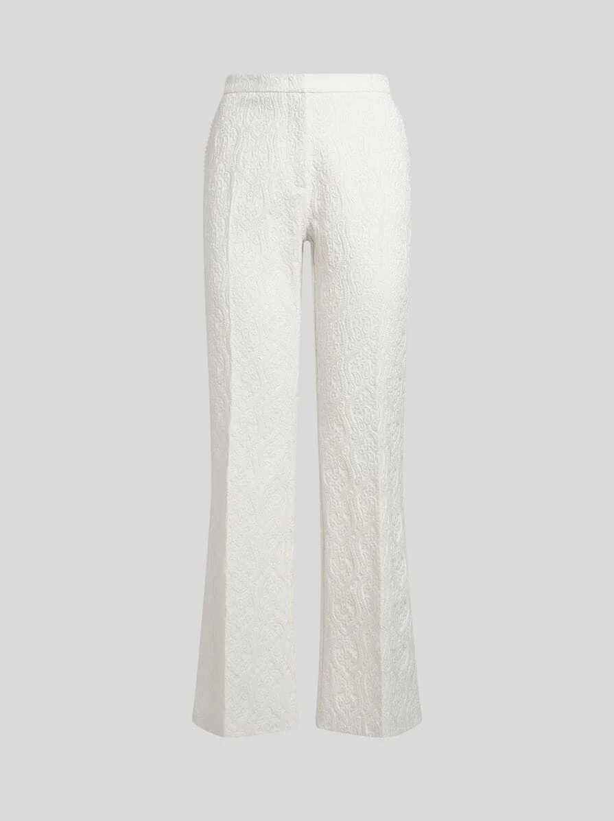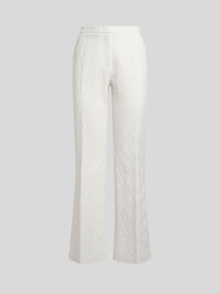 Flared tailored trousers in cotton-blend jacquard fabric with tonal Paisley motif. These feature classic pressed creases and trim-adorned pockets. • Flared fit • Side slip pockets • Rear welt pockets • Concealed hook and zip closure • Made in Italy • The model is 5' 9½" (177 cm) tall and wears a size 40 PRODUCT DETAILS • 59% cotton, 40% viscose, 1% elastane • Details: 92% cotton, 8% polyester