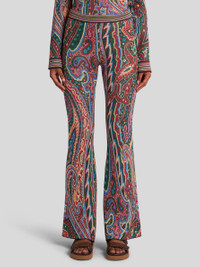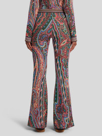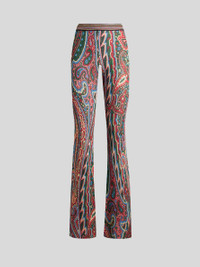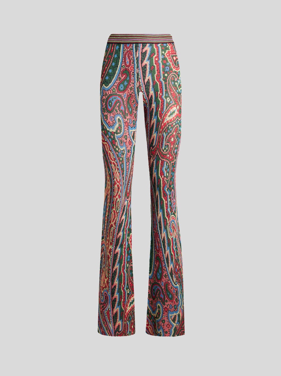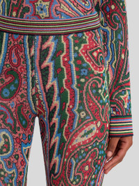 Knit trousers with snug fit at the sides and flared hems. This model is made from the iconic jacquard fabric with a multicoloured Paisley motif all over. • Slim fit • High waist • Elasticated waist • Made in Italy • The model is 5' 9½" (177 cm) tall and wears a size 40 PRODUCT DETAILS • 75% viscose, 25% polyester