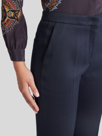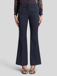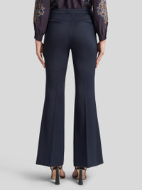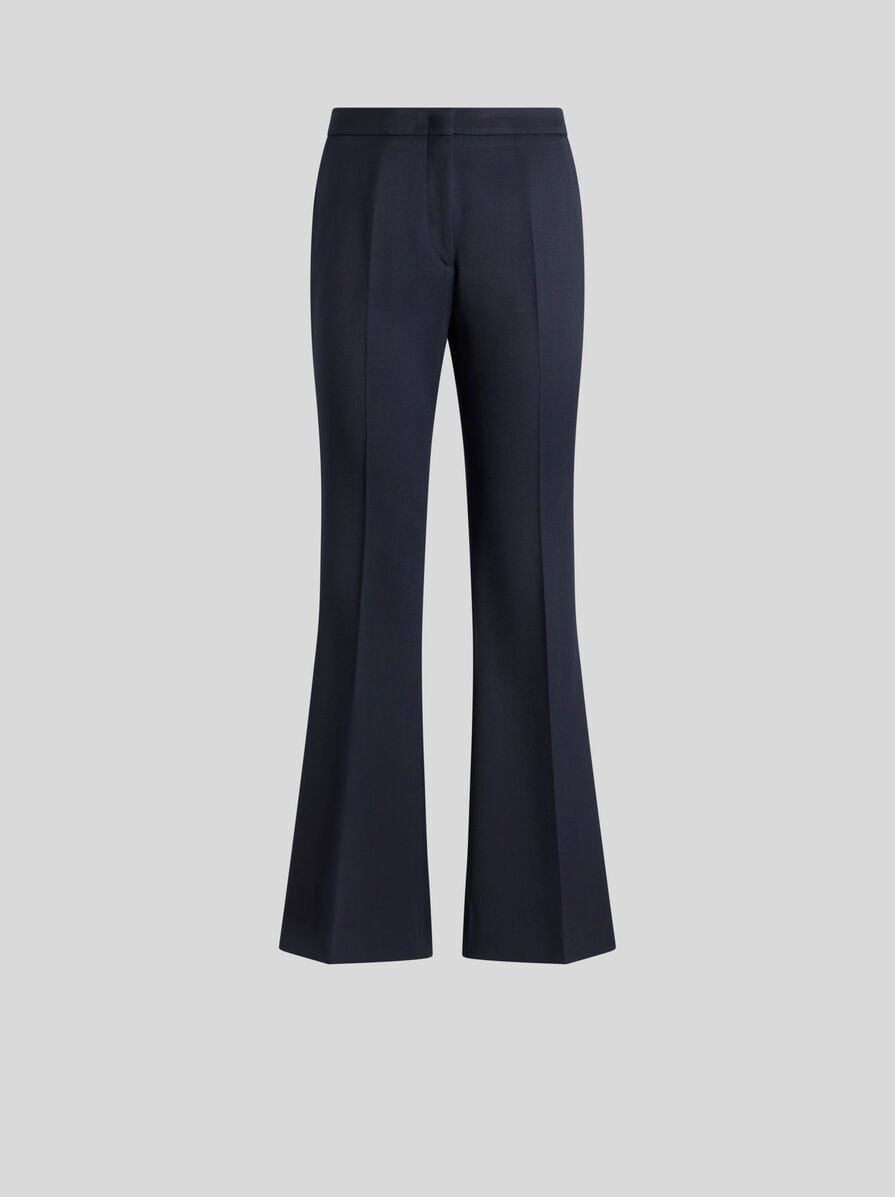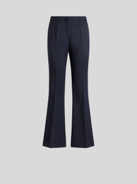 Flare-fit trousers with pressed creases,, snug fit at the sides and flared bottom. This model is made from stretch wool-blend gabardine. • Slim fit • High waist • Hook and zip closure • Side pockets • Rear welt pockets • Made in Italy • The model is 5’10” (178 cm) tall and wears a size 40 (IT) PRODUCT DETAILS • 52% polyester, 44% wool, 4% elastane