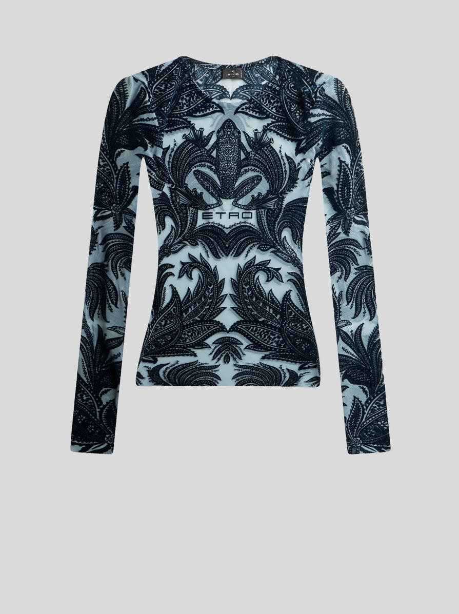 Slim-fit top in flocked stretch tulle fabric with frog motif and ETRO logo on the front. The garment is unlined. • Fitted • Wide crew neck • Long sleeves • Made in Italy • The model is 5' 9½" (177 cm) tall and wears a size 40 PRODUCT DETAILS • 93% polyamide, 7% elastane
