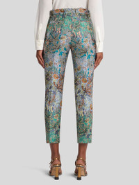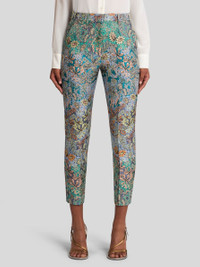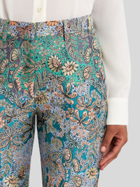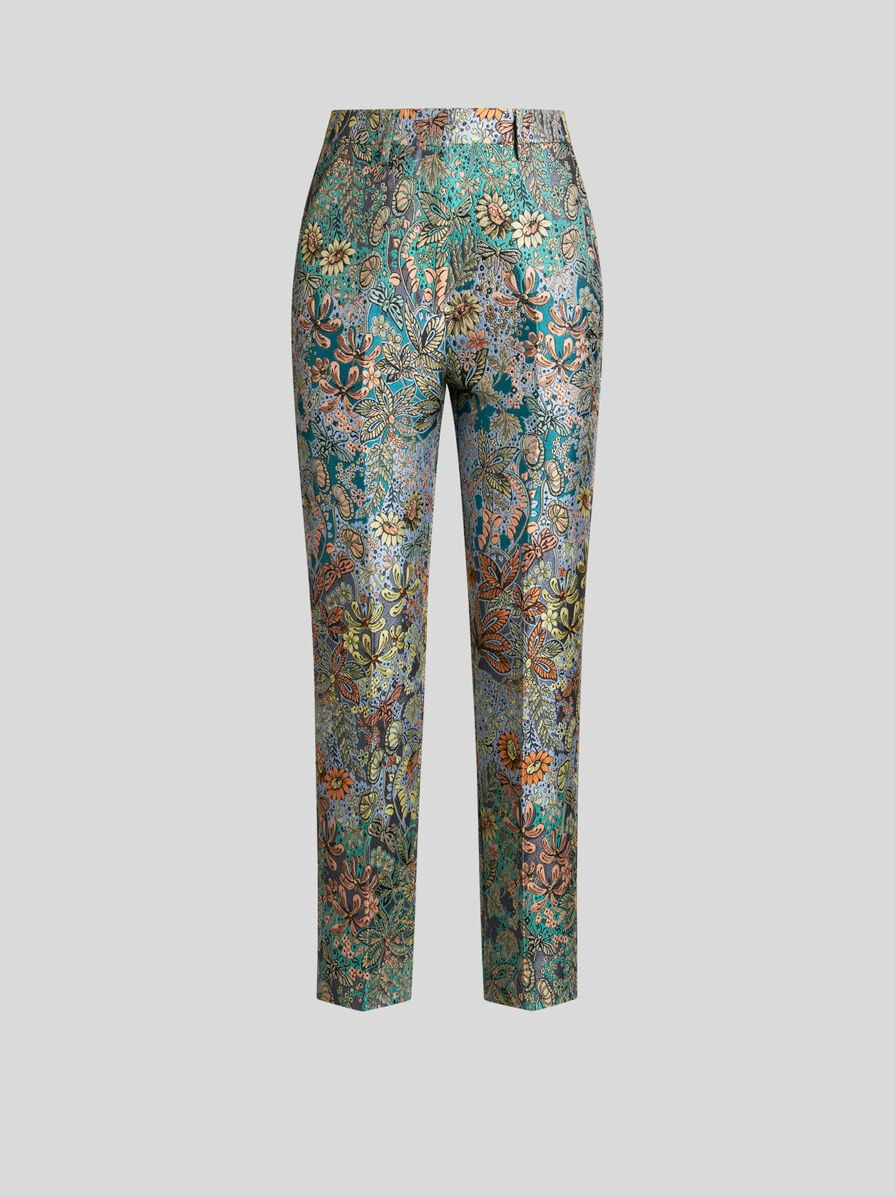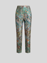 Cigarette trousers with high waist and pressed creases. This model is made from cotton-blend fabric and stands out for its floral jacquard motif all over. • Cropped cigarette fit • High waist • Concealed hook and zip closure • Side pockets • Rear welt pockets • Made in Italy • The model is 5' 9½" (177 cm) tall and wears a size 40 PRODUCT DETAILS • 65% polyester, 21% viscose, 14% cotton