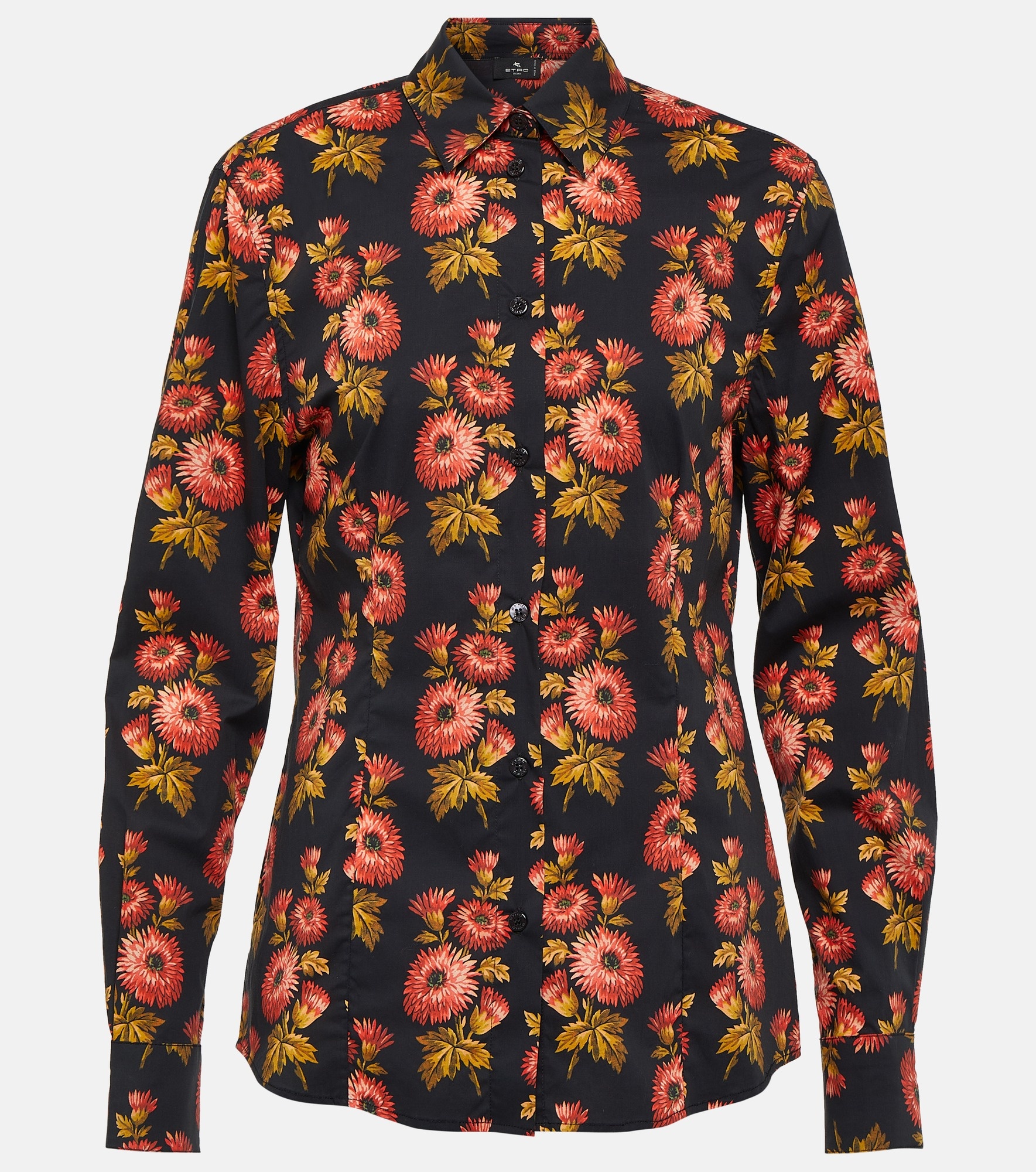 This Etro shirt is made from a soft cotton blend with a touch of stretch for comfort and finished with a vibrant floral print. Product Details - Material: 3% elastane, 97% cotton - Care instructions: machine wash at 30 degrees - Made in Italy - Designer color name: Nero - Closure: buttoned front - Item number: P00824845 Size & Fit - True to size - Cinched waist - Mid-weight material - Falls to the hip - The model seen in the picture is 178cm-5'10" and wearing a size IT 40
