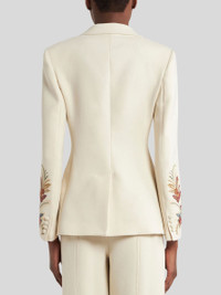 Single-breasted jacket in cool wool-blend fabric. This garment stands out for its two contrasting floral embroideries at the sleeve ends. • Fitted • Peak lapels • Breast patch pocket • Two front patch pockets • Single-breasted two-button closure • Made in Italy • The model is 5' 9½" (177 cm) tall and wears a size 40 PRODUCT DETAILS • 52% polyester, 44% wool, 4% elastane • Embroidery: 100% polyester • Lining: 52% viscose, 48% acetate