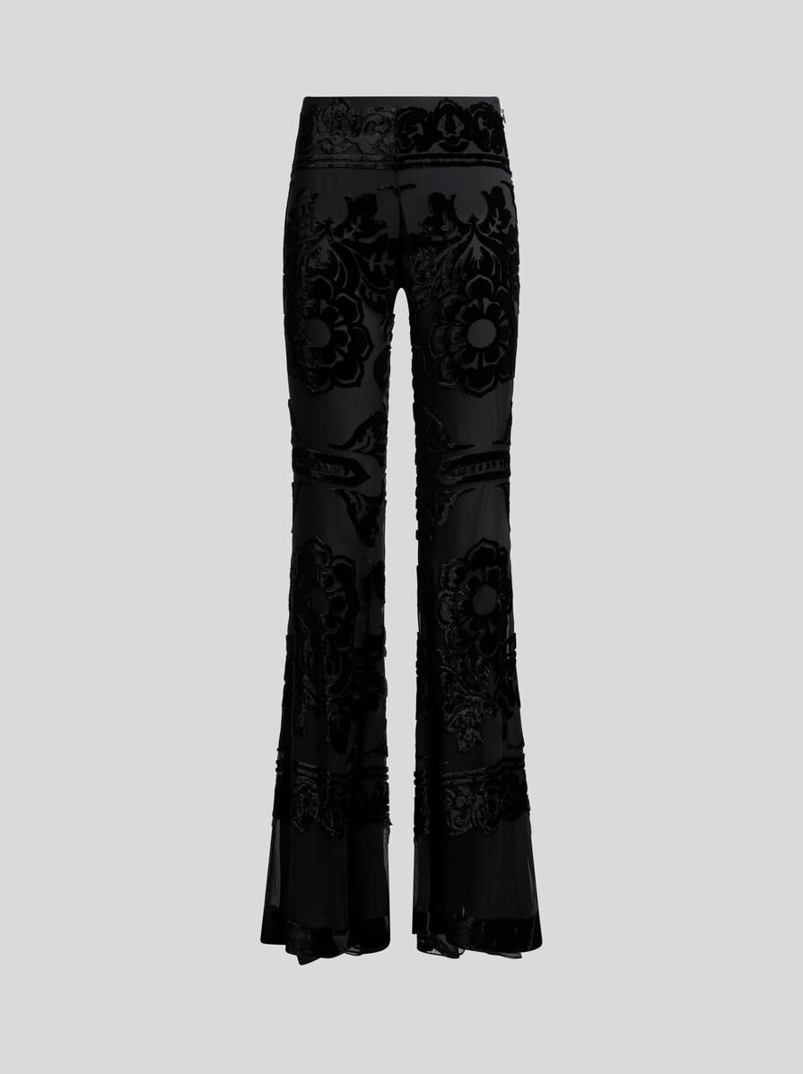 Trousers with snug fit at the sides and wide flared hems. The item is made from burnout velvet jacquard and boasts a see-through effect and stencil-like floral motif. The item was presented at the Spring-Summer 25 Women's Runway Show. • Flared fit with wide hems • Regular waist • Inner high-waisted panties • Made in Italy • The model is 5' 9½" (177 cm) tall and wears a size 40 PRODUCT DETAILS • 53% viscose, 47% silk • Interior: 100% polyester