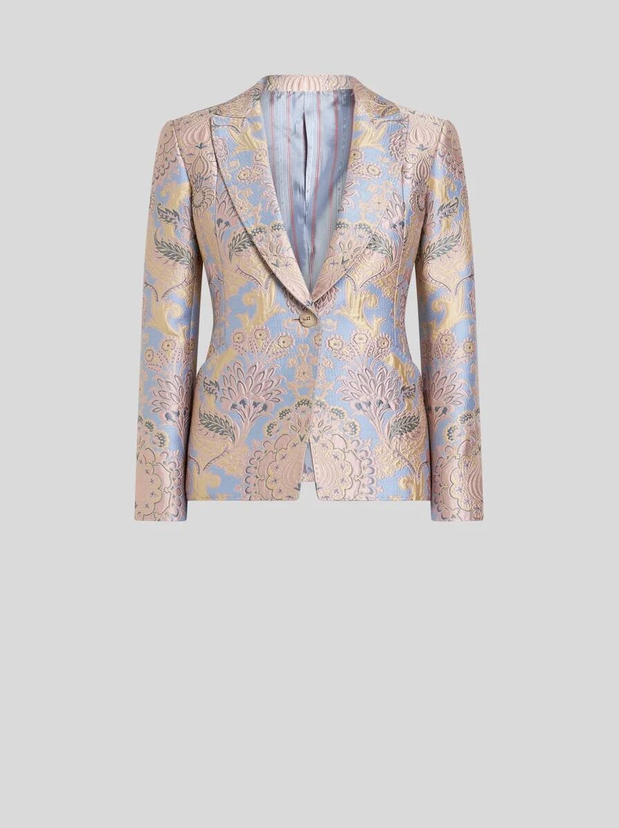 Single-breasted jacquard brocade jacket with placed floral motif. • Fitted • Peak lapels • Single-breasted, single-button closure • Welt side slip pockets • Made in Italy • The model is 5' 9½" (177 cm) tall and wears a size 40 PRODUCT DETAILS • 82% polyester, 18% polyamide • Lining: 52% viscose, 48% acetate
