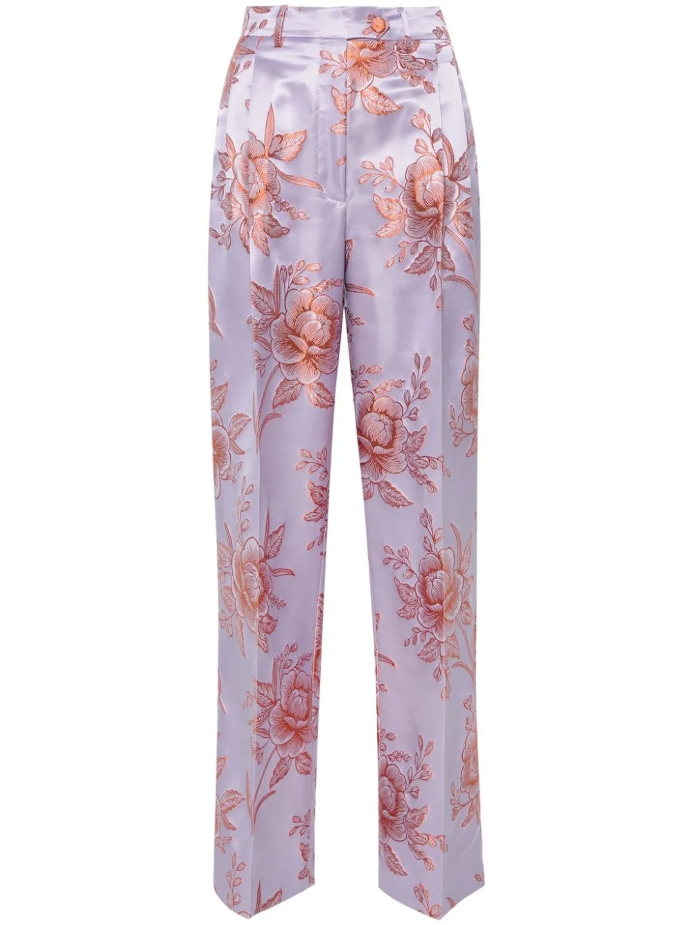 floral-jacquard satin trousers Showing ETRO's love for bold prints and patterns, these lilac purple trousers are decorated by contrasting floral jacquard. Made from a silk blend, they've a comfortable fluid design. Highlights - Lavender purple/orange - Satin finish - Floral patterned jacquard - Pleat detailing - High-waisted - Belt loops - Front button and zip fastening - Wide leg - Two side slit pockets - Two rear button-fastening jetted pockets - Straight hem - Long length Made in Italy Composition Polyester 44%, Viscose 30%, Silk 26% SIZE & FIT Model measurements Height 5 ft 11 in(1.8 m) Bust/Chest 34.25 in(87 cm) Hips 35.82 in(91 cm) Waist 24.8 in(63 cm) FittingInformation Designed with a wide-leg cut, these trousers allow for a close fit at the waist and offer a loose and roomy fit over the leg Made from a midweight non-stretch fabric This piece fits true to size – take your usual size Measurement FRONT RISE 11.49 in(29.2 cm) INSIDE LEG 32.51 in(82.6 cm) BACK RISE 13.5 in(34.3 cm) HIPS 32 in(81.3 cm) Hem Width 19.01 in(48.3 cm) WAIST 25.98 in(66 cm)