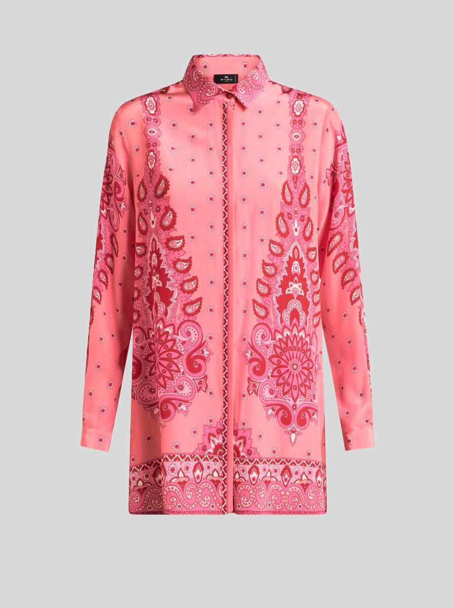Long, straight-cut shirt in pure silk crepe de chine. This model is embellished with a floral pattern all over and a placed, tone-on-tone medallion and Paisley motif. • Regular fit • Classic collar • Long sleeves • Working cuffs • Side splits • Concealed button closure on the back • Made in Italy • The model is 5' 9½" (177 cm) tall and wears a size 40 PRODUCT DETAILS • 100% silk