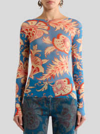 Slim-fitting long-sleeved top in stretch tulle fabric embellished with floral-inspired all-over maxi print. The item was presented at the Spring/Summer 26 Runway Show. • Fitted • Crew neck • Long sleeves • Made in Italy • The model is 5' 9½" (176 cm) tall and wears a size 40 PRODUCT DETAILS • 100% polyamide